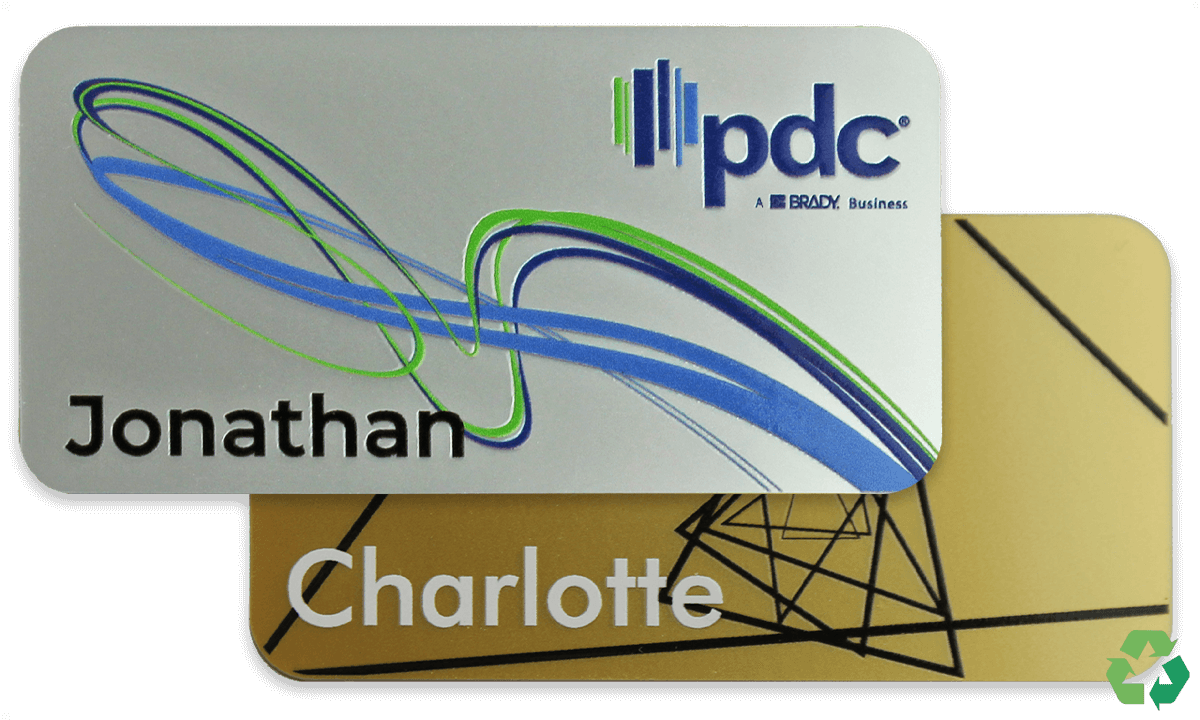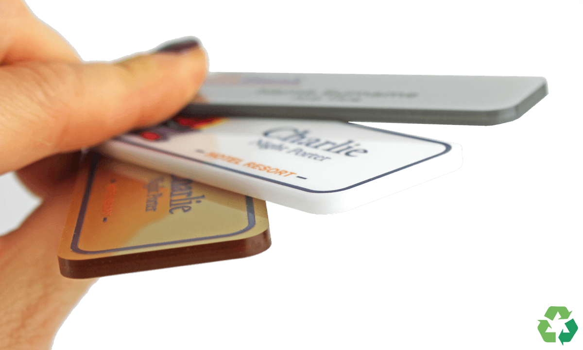 The production of the badge uses less water and CO2 than production of new acrylic, making our badge the ethical choice. The thick, glossy badge is digitally printed with your logo and em-ployee data, and protected with a raised, shiny coating. Unlike other digitally printed badges, no doming is necessary.