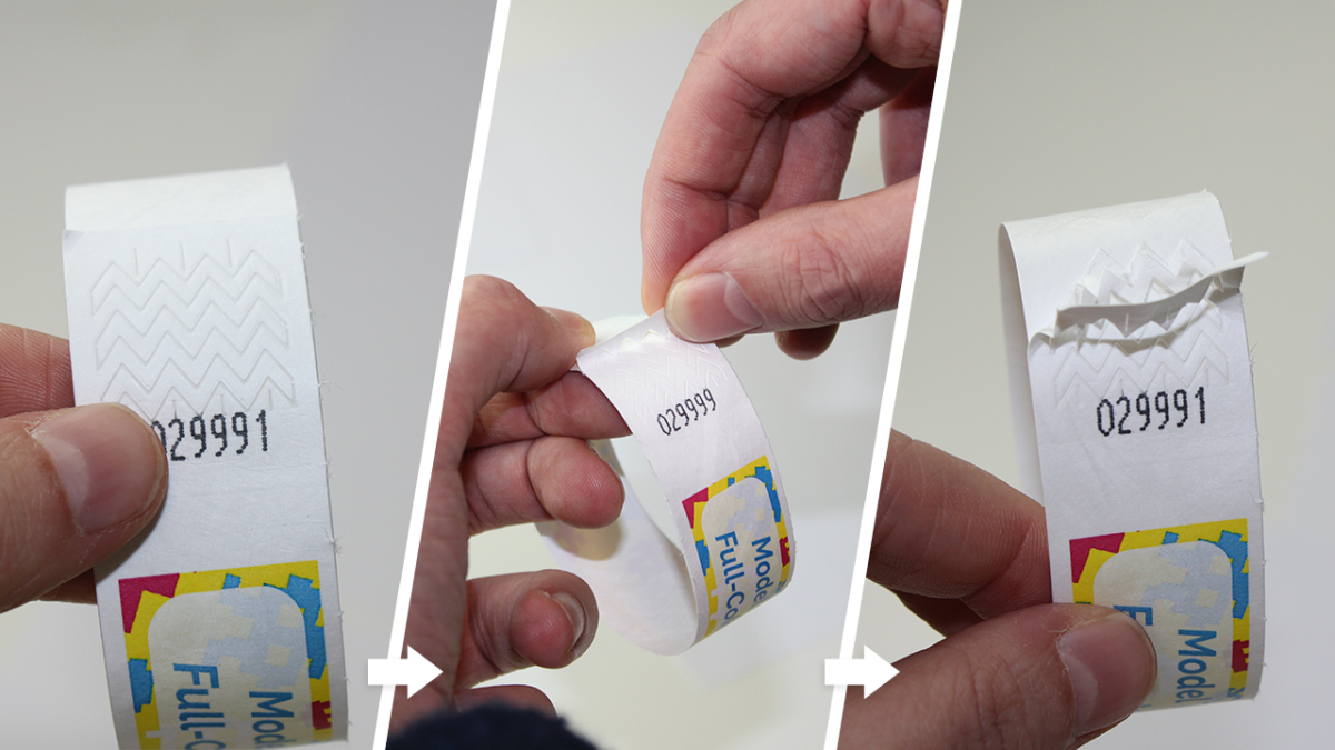 - Strong adhesive closure and unique tamper cuts cause wristbands to shred if tampered with